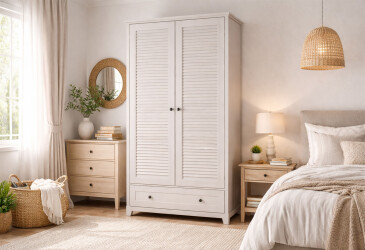 - Киевский стандарт, МДФ, ламинированная ДСП, система открывания Tip-On, штанга и полки, минимализм, нимфея альба / белый мат, 6D.