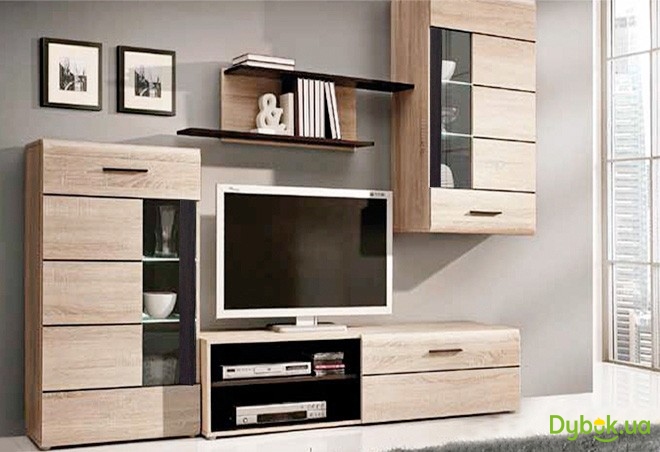 - Гарнитур. Такая система устанавливается вдоль одной стены в спальне или гостиной. Яркий пример — стенка, включающая в себя книжные полки, платяной шкаф, витрины, вместительные антресоли, тумбу под телевизор, дополнительные комоды.