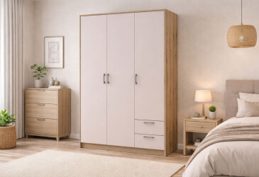- Doros, ламинированная ДСП, ламинированная ДСП, телескопические направляющие полного выдвижения, штанга, полки и ящики, минимализм, дуб артизан / кашемир, 3D.
