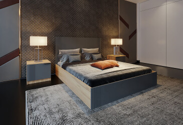 - 160х200, ВМК, ламинированная ДСП, патинированная МДФ, телескопические направляющие полного выдвижения, классические, с трёхдверным шкафом.