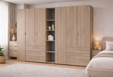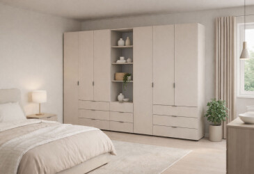 - Doros, ламинированная ДСП, ламинированная ДСП, роликовые направляющие, штанга, полки и ящики, минимализм, кашемир, 5D.