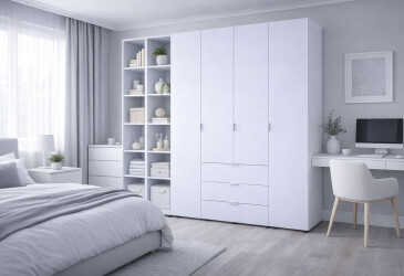 - в наличии, Doros, ламинированная ДСП, ламинированная ДСП, роликовые направляющие, штанга, полки и ящики, минимализм, белый, 4D.