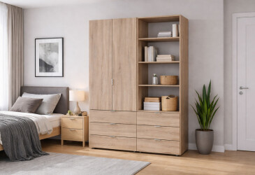 - Doros, ламинированная ДСП, ламинированная ДСП, телескопические направляющие полного выдвижения, штанга, полки и ящики, модерн, дуб сонома, 4D.