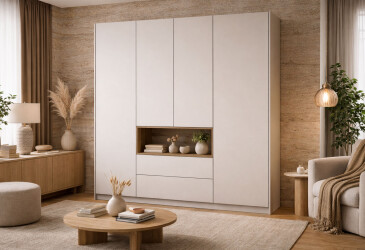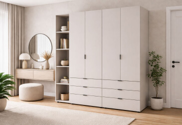 - Doros, ламинированная ДСП, ламинированная ДСП, роликовые направляющие, штанга, полки и ящики, минимализм, кашемир, 4D.