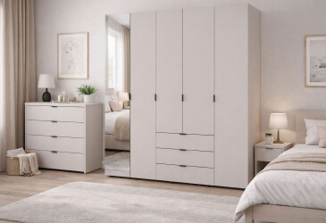 - Doros, ламинированная ДСП, стекло, ламинированная ДСП, роликовые направляющие, штанга, полки и ящики, минимализм, кашемир, 4D.