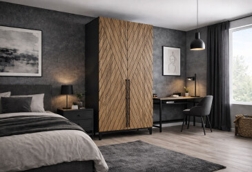 - Doros, ламинированная ДСП, стекло, ламинированная ДСП, телескопические направляющие полного выдвижения, штанга, полки и ящики, минимализм, дуб артизан / графит, 2D.