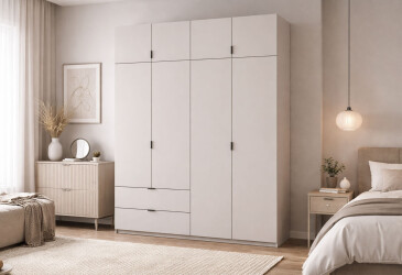 - Doros, ламинированная ДСП, ламинированная ДСП, телескопические направляющие полного выдвижения, штанга, полки и ящики, модерн, кашемир, 4D.