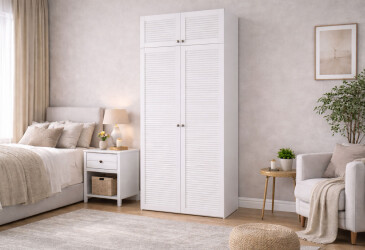 - VIP-master, дерево, ДСП, петли с доводчиками, штанга и полки, модерн, белый, 2D.