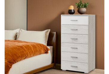 - MiroMark, глянцевая ДСП, ламинированная ДСП, телескопические направляющие полного выдвижения, модерн, дуб крафт / белый, с 6 ящиками.
