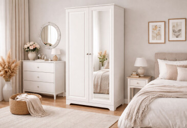 - в наличии, Doros, ламинированная ДСП, стекло, ламинированная ДСП, роликовые направляющие, штанга, полки и ящики, минимализм, белый, 4D.