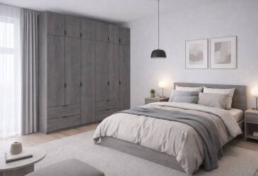 - Moreli, ламинированная ДСП, ламинированная ДСП, петли с доводчиками, регулируемые ножки, овальная черная штанга, штанга и полки, современный, бетон тефра, 4D.