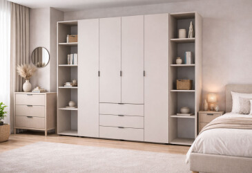 - Doros, ламинированная ДСП, ламинированная ДСП, роликовые направляющие, штанга, полки и ящики, минимализм, кашемир, 5D.