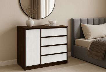 - Киевский стандарт, ламинированная ДСП, ламинированная ДСП, телескопические направляющие полного выдвижения, модерн, венге / белый структурный new, с 4 ящиками, с дверками.