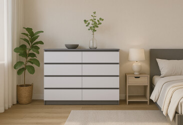 - Киевский стандарт, ламинированная ДСП, ламинированная ДСП, телескопические направляющие полного выдвижения, модерн, антрацит / нимфея альба, с 8 ящиками.