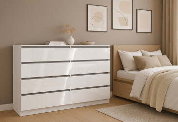 - Киевский стандарт, МДФ, ламинированная ДСП, телескопические направляющие полного выдвижения, модерн, нимфея альба / белый глянец, с 8 ящиками.