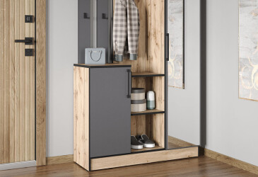 - пластиковые, Moreli, ламинированная ДСП, ламинированная ДСП, петли с доводчиками, полки, лофт, дуб аппалачи / антрацит, со шкафом с распашными дверями.