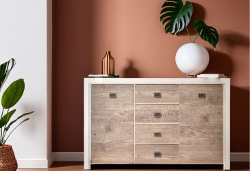- в наличии, ВМК, ламинированная ДСП, МДФ, ламинированная ДСП, телескопические направляющие полного выдвижения, классические, сосна аризонская / дуб корабельный, с 4 ящиками, с дверками.