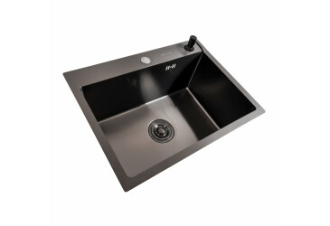 - центральна, підходить євросифон (широка горловина, 110 мм), в наличии, Platinum, матовая, чёрный, прямоугольная, 220 мм, отвір під змішувач та дозатор, 2 чаши, врезная, нержавіюча сталь з PVD покриттям.