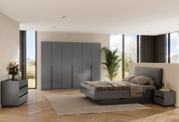 - 160х200, MiroMark, глянцевая ДСП, ламинированная ДСП, телескопические направляющие полного выдвижения, современный, мат антрацит / мат графит, с четырехдверным шкафом, с двухдверным шкафом.