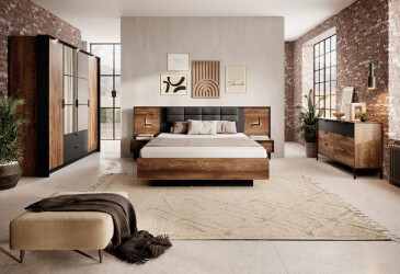 - 160х200, Perfect Home, ламинированная ДСП, ламинированная ДСП, телескопические направляющие полного выдвижения, современный, каштан / антрацит, с четырехдверным шкафом.