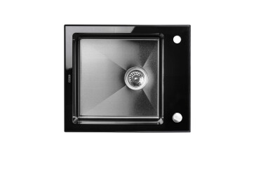 - чаша справа, підходить євросифон (широка горловина, 110 мм), Platinum, глянцевая, чёрный, прямоугольная, 200 мм, отвір під змішувач та дозатор, 1 чаша, накладная, нержавіюча сталь з PVD покриттям + скло.