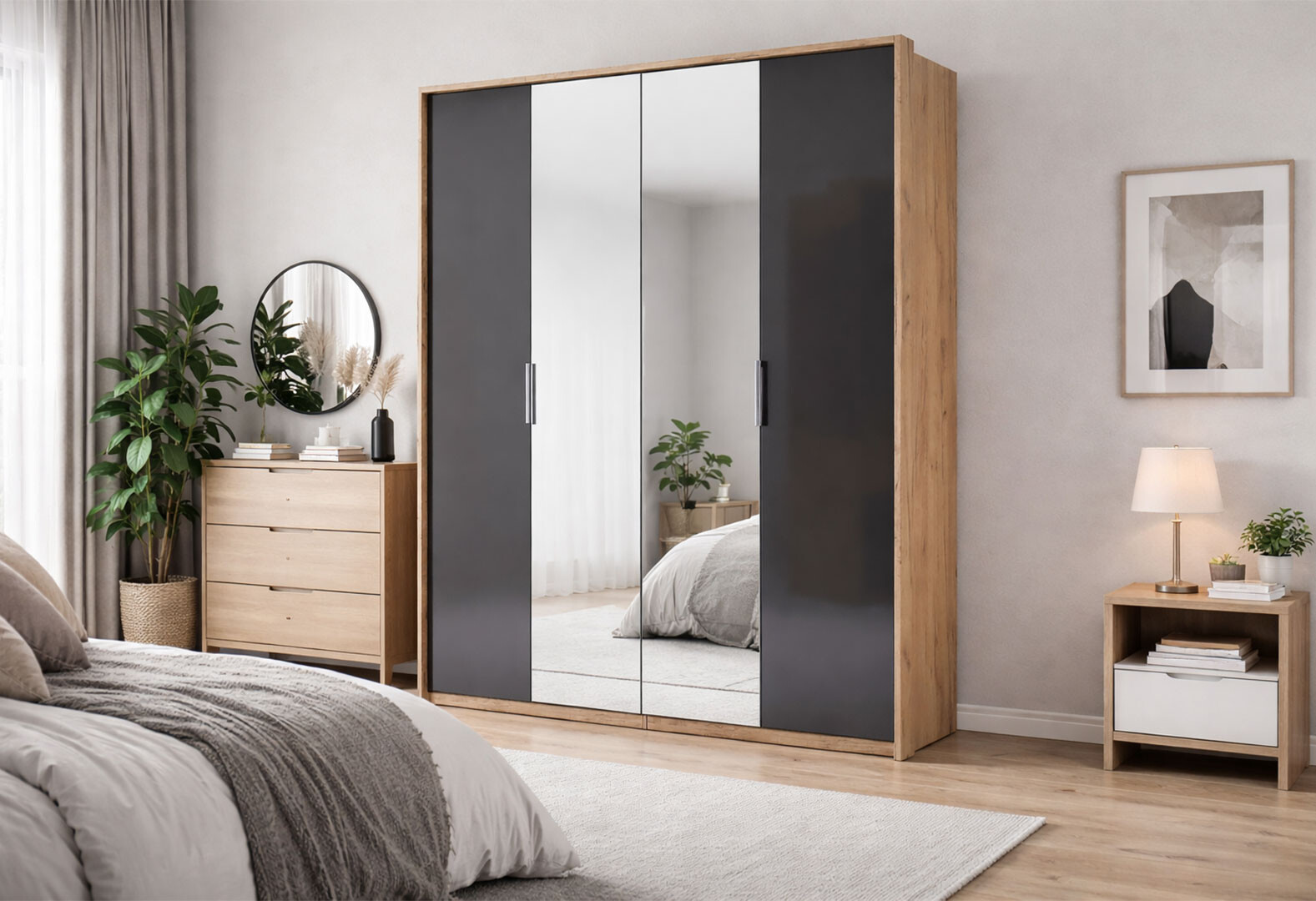 Шкаф МироМарк Луна 4-дверный с зеркалами 184 см Лава/Дуб Крафт, серия Н