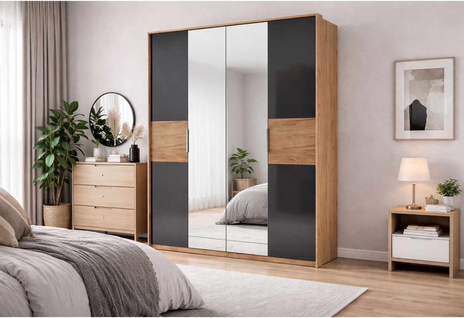 - Шкаф МироМарк Рамона 4-дверный с зеркалом 184 см Дуб крафт/Лава, серия Н