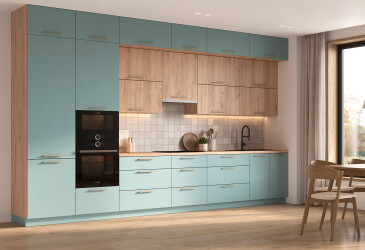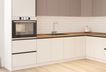 Она спроектирована таким образом, чтобы обеспечить максимальный объем места для встроенной техники за счет минимального количества шкафчиков и тумб. Такой вариант кухни приглянется для тех, кто является сторонником минимализма в интерьере.