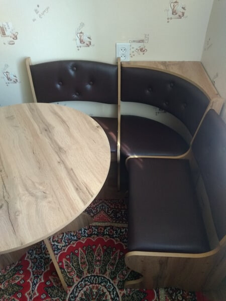 ДСП характеризуется прочностью и водостойкостью. Кухонный уголок позволяет эффективно использовать пространство в кухни, на нём можно разместить большее количество людей. Кухонные уголки выполняются из ткани или кожзама, которые способны отталкивать воду и легко поддаются чистке.