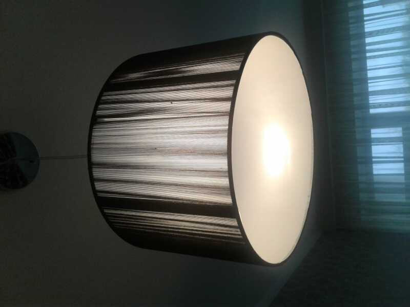 Достоинства: За свои деньги люстра хорошая. Сам абажур не из ткани, а из нитей, которые обмотаны вокруг пластиковой основы. Смотрится стильно.