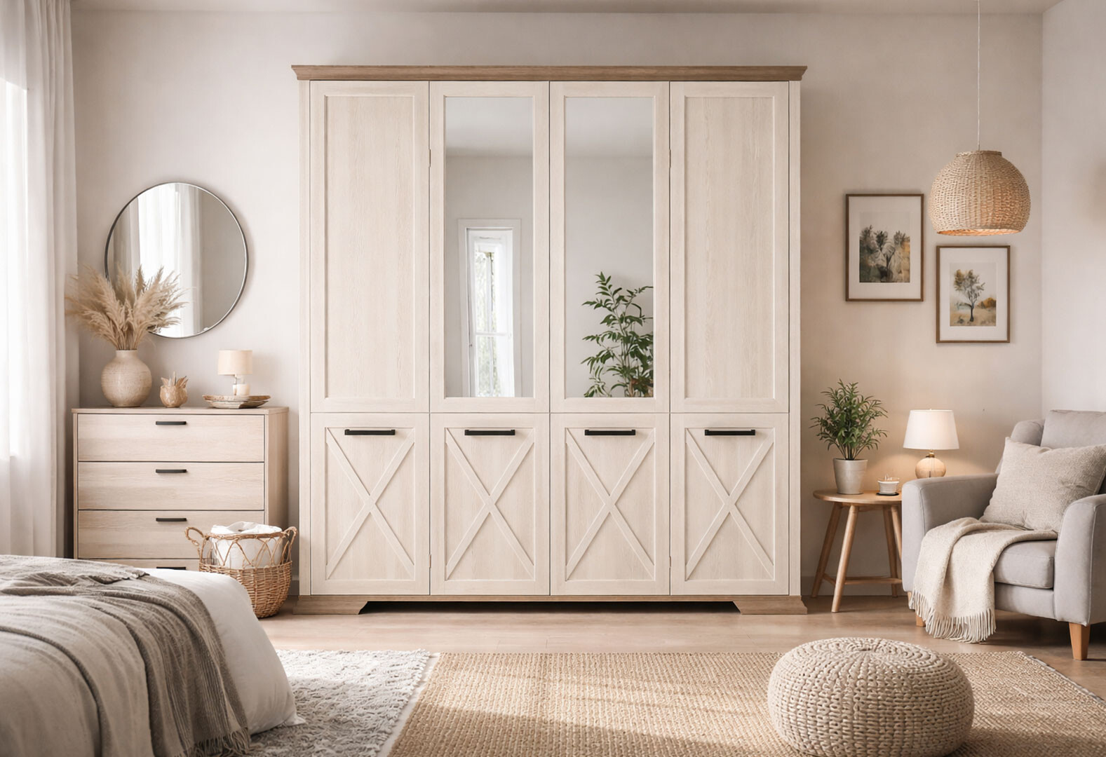Шкаф Gerbor холдинг Марсель 4-дверный с зеркалом 216 см Ясень снежный/Дуб сонома трюфель