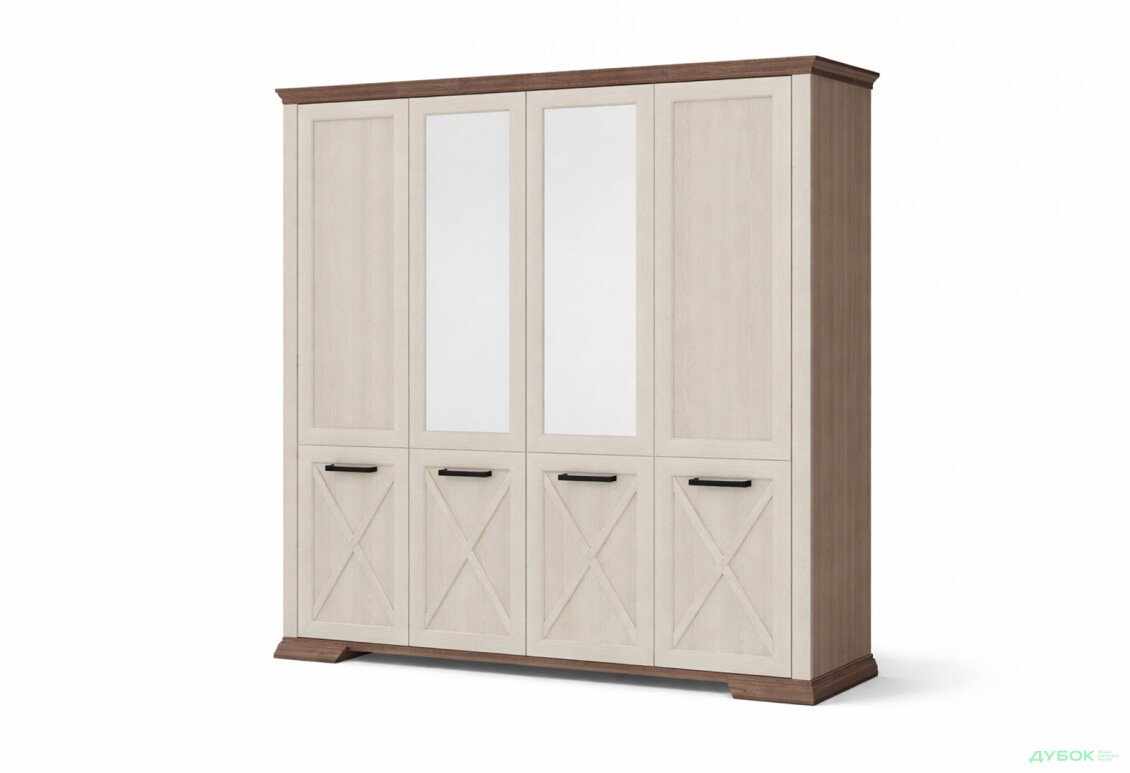 Обращает на себя внимание необычное оформление фасадов в виде перекрещения накладок на ДСП фасадах. Несмотря на массивные модули, мебель выглядит очень нежно и уникально, что безусловно будет привлекать внимание и восхищение каждого!