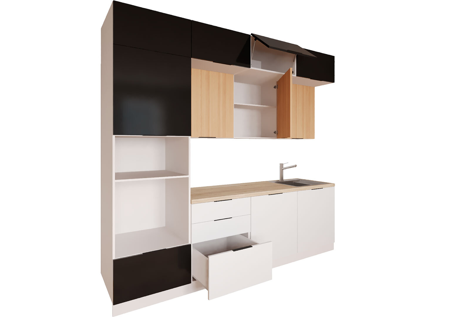 Кухня Мебель Стар Диплос / Diplos Blum 240 см, верх черный глянец / натуральное дерево, низ белый глянец