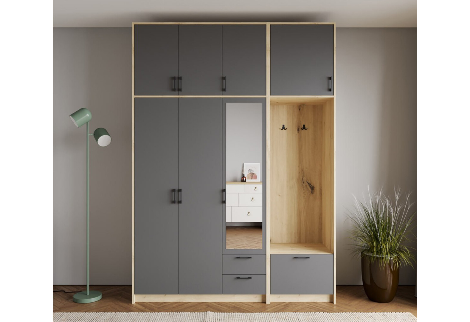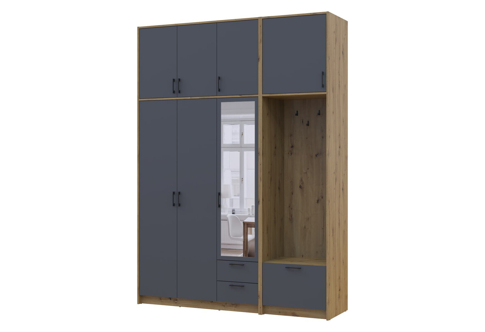 - Шкаф для одежды 3 ДСП Doros Ронди с вешалкой, зеркалом и высокой антресолью 181 см Дуб Артизан / Графит