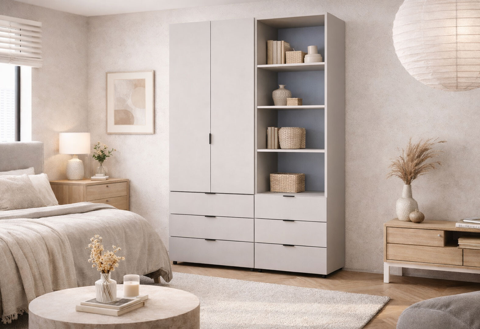 - Шкаф Doros Гелар 2 ДСП 2-дверная с ящиками и пеналом с открытыми полками 137.5 см Кашемир