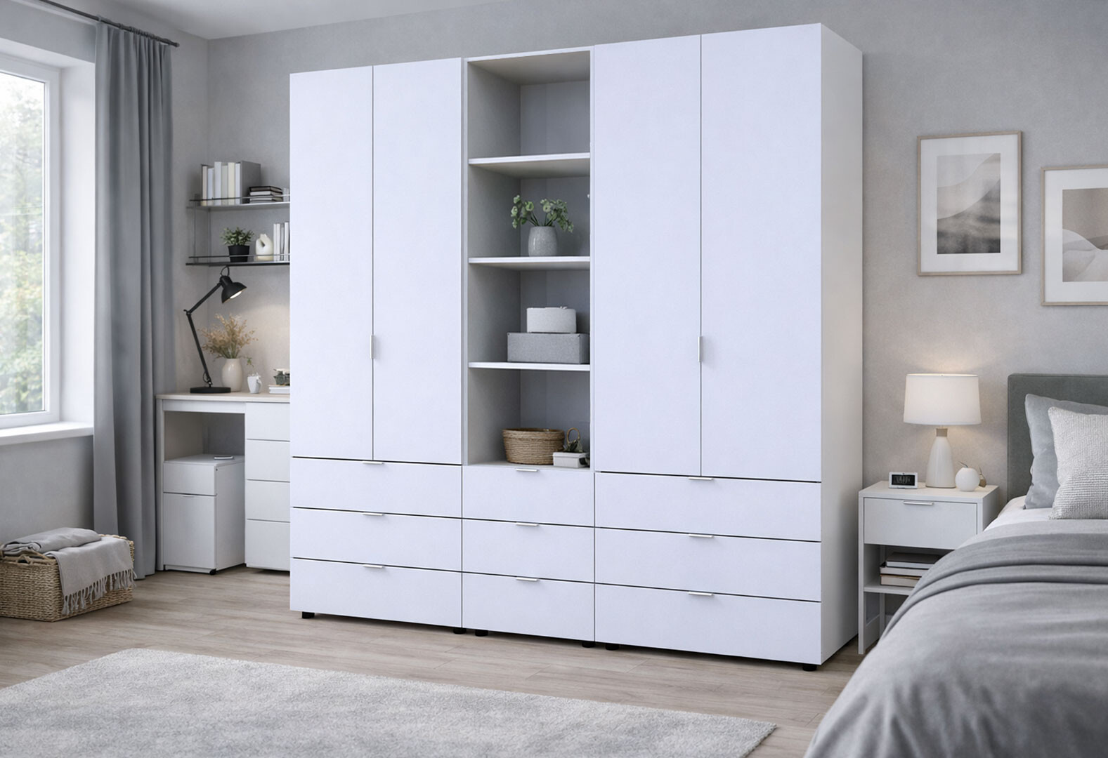 - Шкаф Doros Гелар 2+2 ДСП 4-дверная с ящиками и пеналом с открытыми полками 215 см Белый