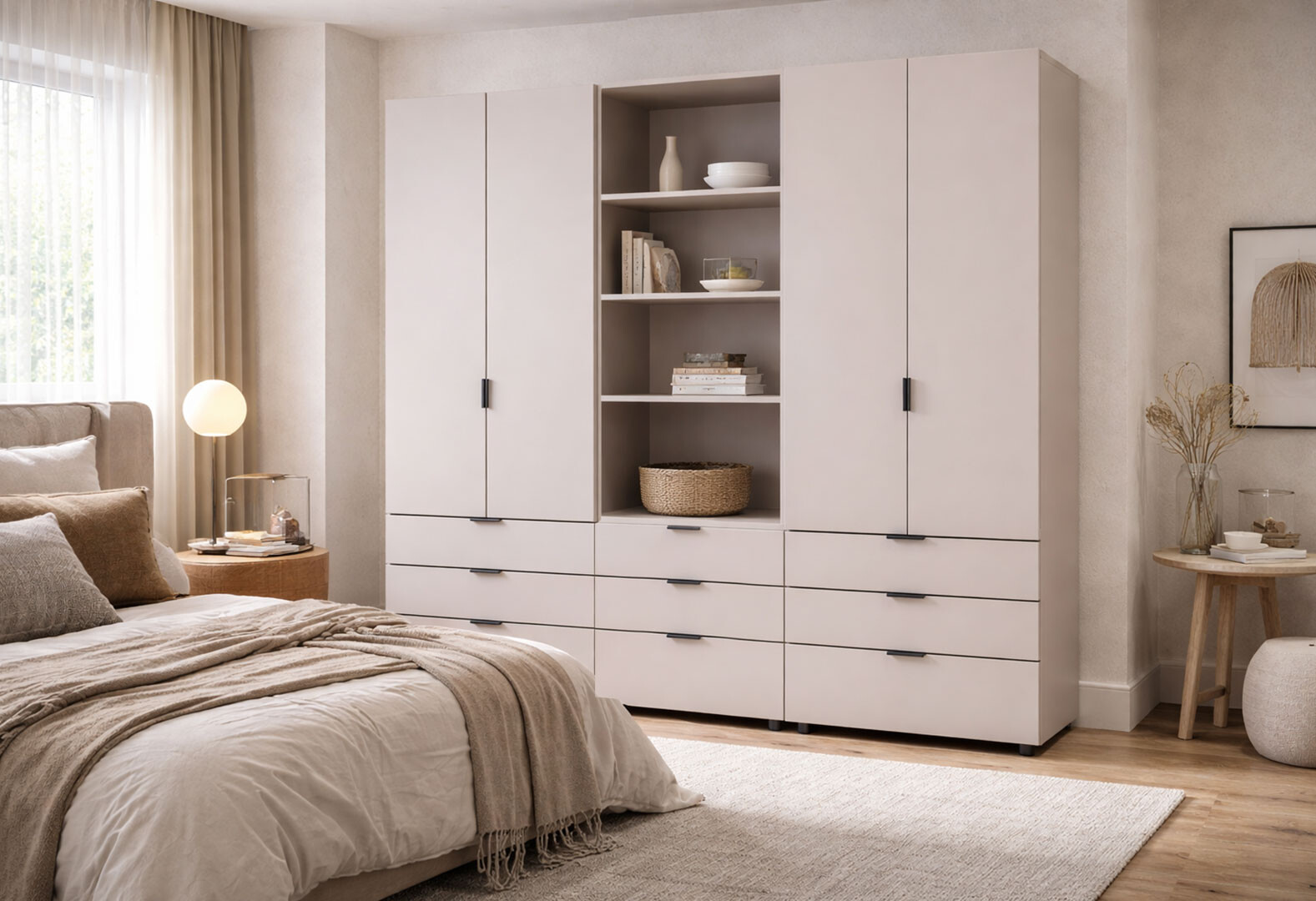 - Шкаф Doros Гелар 2+2 ДСП 4-дверная с ящиками и пеналом с открытыми полками 215 см Кашемир