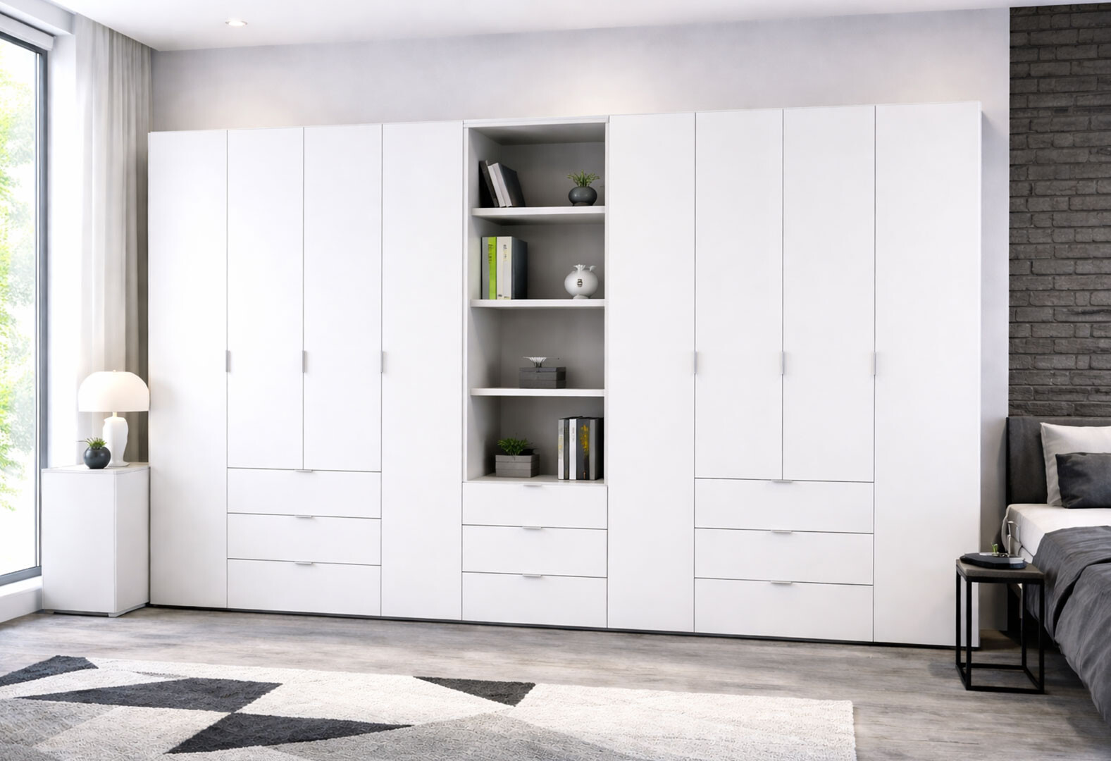 - Шкаф Doros Гелар 4+4 ДСП 8-дверная с ящиками и пеналом с открытыми полками 370 см Белый