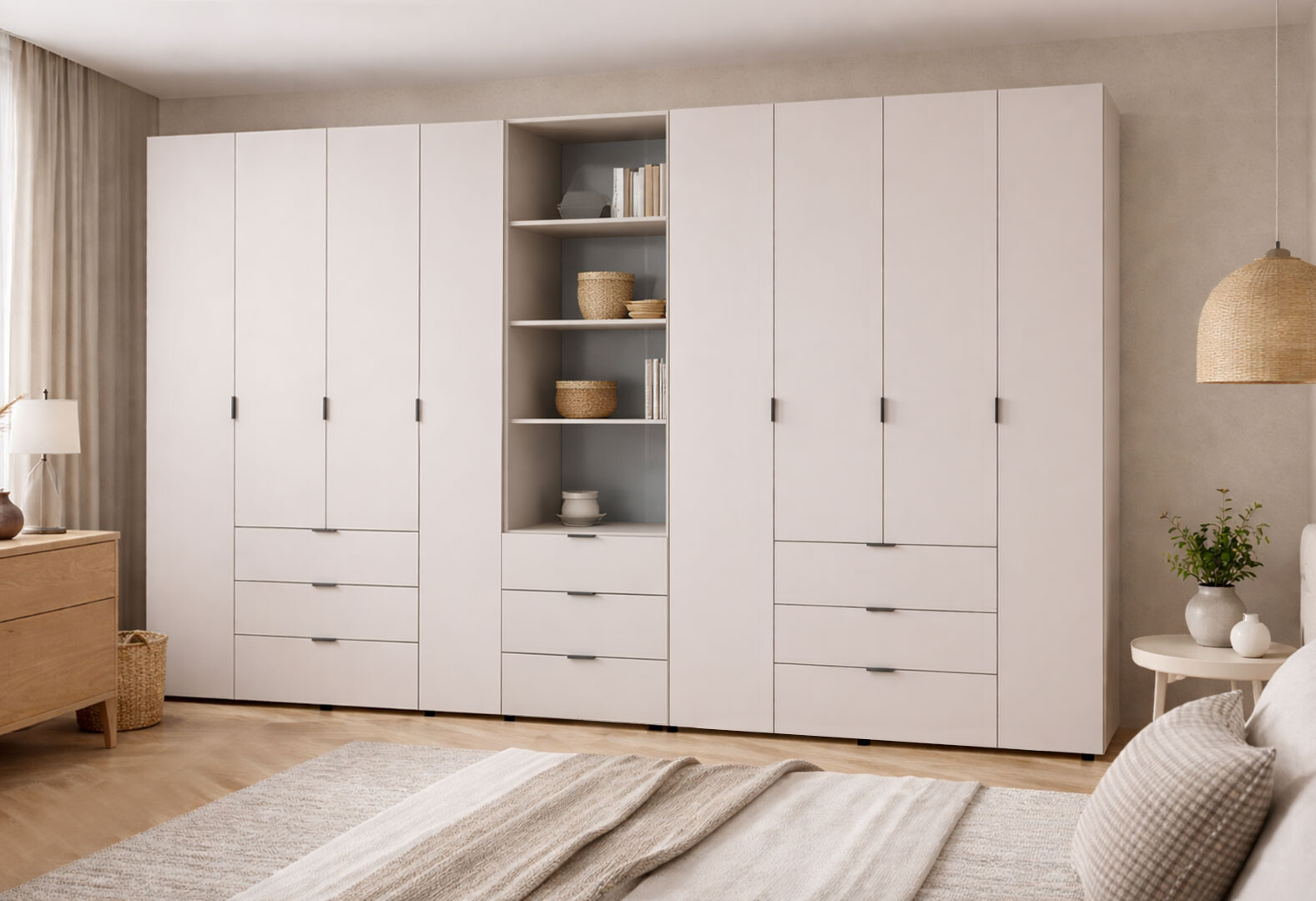 - Шкаф Doros Гелар 4+4 ДСП 8-дверная с ящиками и пеналом с открытыми полками 370 см Кашемир