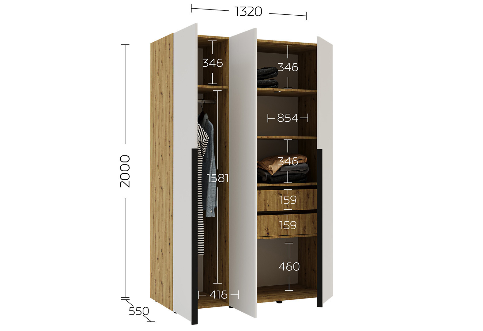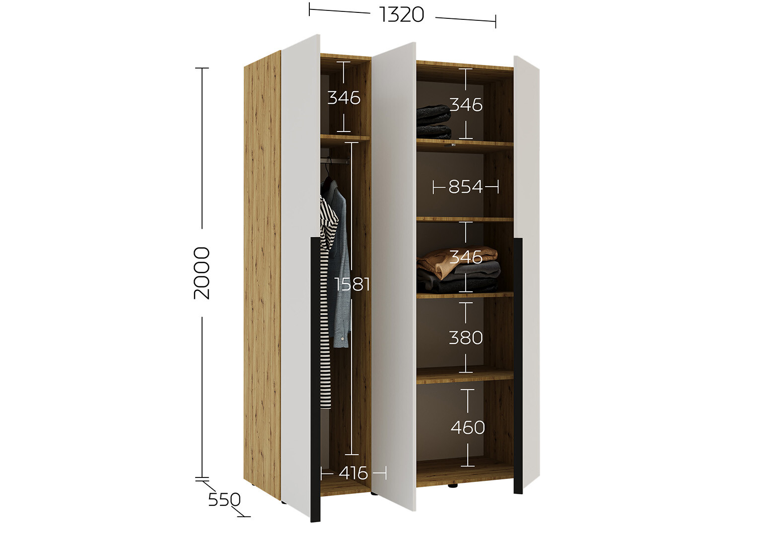 Шкаф Garant Соло 3D с полками и штангой 132 см, дуб артизан / нимфея альба