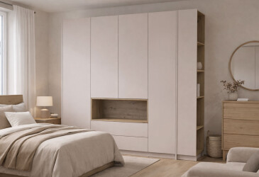 - Doros, ламинированная ДСП, ламинированная ДСП, роликовые направляющие, штанга, полки и ящики, минимализм, кашемир, 5D.
