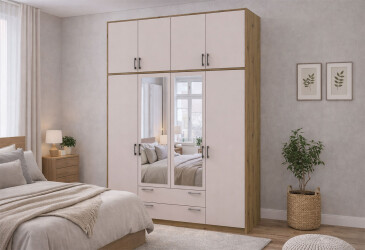 - Doros, ламинированная ДСП, ламинированная ДСП, штанга, полки и ящики, минимализм, кашемир / дуб артизан, 4D.
