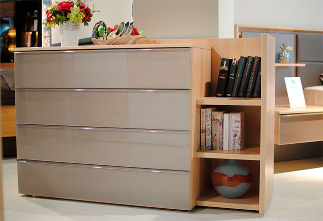 Також, такий комод часто не комплектується ручками, а ящики відкриваються з допомогою системи направляючих Push (від натискання на фасад), або за допомогою виступаючої схованої ручки під фасадом.