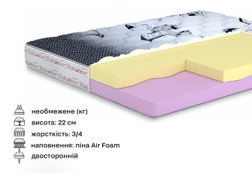 - 120х190, Matroluxe, безпружинний, air foam, піна, Layer Bliss, Comfort Layer, Natural Foam, Прошивка чохла "Зима/Літо", необмежена, II-III Середній, Matroluxe - Romance, безпружинні, без вакуумної скрутки.