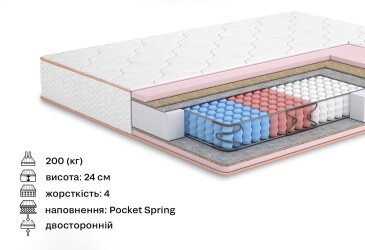 Матрац може мати залежні Bonnel пружини, незалежний блок пружин Pocket Spring або безпружинну конструкцію. Кожен з них має свої переваги та недоліки, з якими можна познайомитися у наших статтях або ж поспілкувавшись із консультантом.