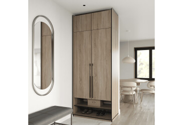 - Moreli, ламінована ДСП, ламінована ДСП, петлі з дотягувачами, регульовані ніжки, овальна чорна штанга, сучасний, дуб сонома, 2D.