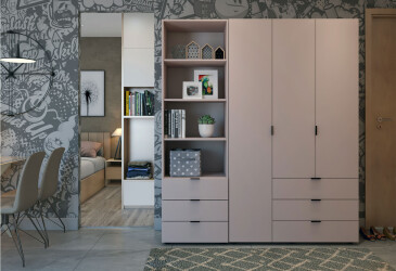 - Doros, ламінована ДСП, ламінована ДСП, штанга, полиці та шухляди, мінімалізм, кашемір / дуб артизан, 3D.