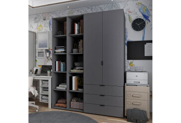 - Doros, ламінована ДСП, ламінована ДСП, штанга, полиці та шухляди, мінімалізм, графіт / дуб евок, 4D.