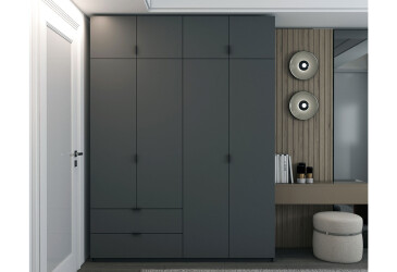 - Doros, ламінована ДСП, скло, ламінована ДСП, роликові напрямні, штанга, полиці та шухляди, мінімалізм, графіт, 4D.