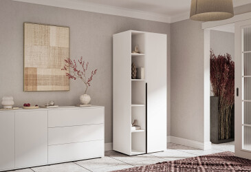 - Doros, ламінована ДСП, скло, ламінована ДСП, роликові напрямні, штанга, полиці та шухляди, мінімалізм, білий, 4D.
